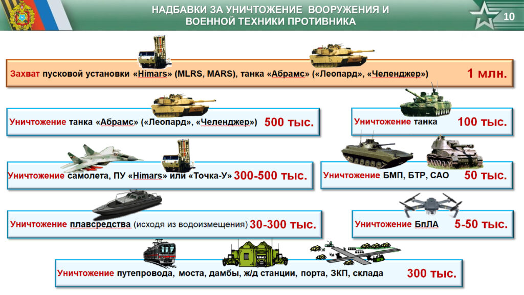 за уничтожение вооружения и военной техники противника в размере от 5 тыс. руб. до 500 тыс. руб. в зависимости от образца вооружения например (за уничтожение пусковой установки «Himars» (MLRS, MARS), танка «Абрамс» («Леопард», «Челенджер» 500 тыс. руб);