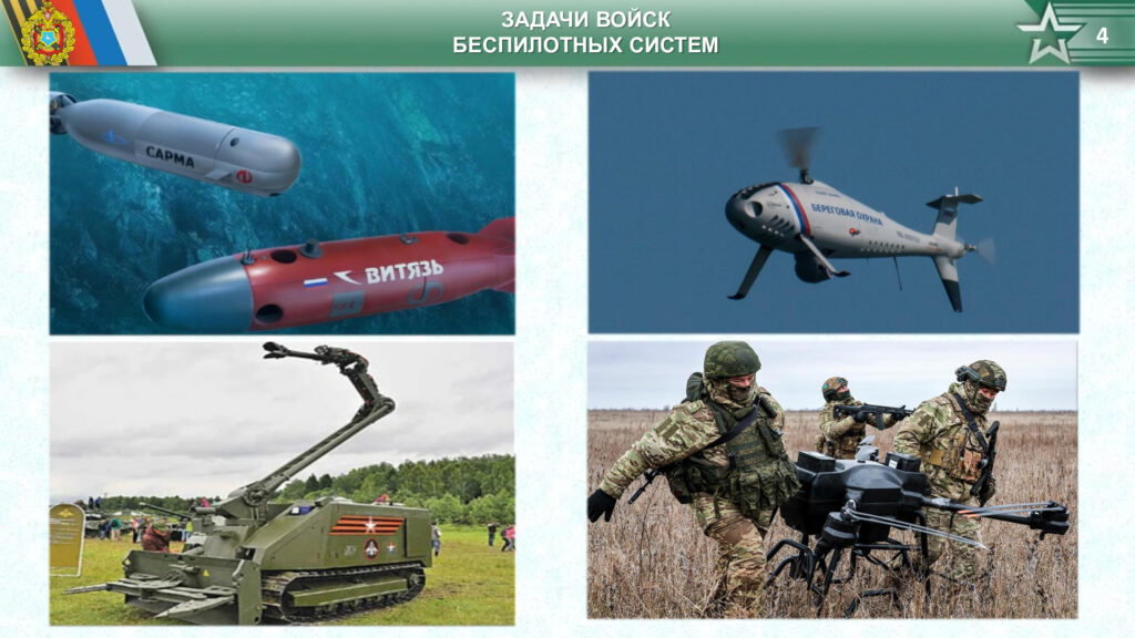 FPV- и оптоволоконными дронами (устойчивые к средствам радиоэлектронной борьбы), но и наземными роботами и безэкипажными катерами. Новый род войск призван объединить различные типы беспилотных систем в единую организационную структуру, способную решать широкий спектр боевых задач, включая разведывательные, ударные и транспортные.